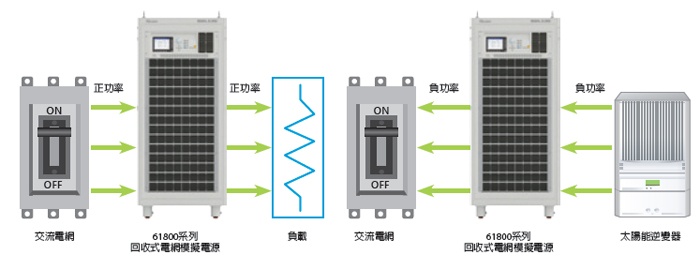 Chroma 61830回收式电网模拟电源是一款定电压输出的可编程交流电源,可应用于一般用电产品(例如: 家电产品,开关式电源)的测试,测试时Chroma 61845回收式电网模拟电源会对负载输出功率,通过拉载过电流设定(OCP)功能来保护Chroma 61830。当待测物为能将能量回馈到电网的产品(例如:太阳能逆变器,双向充放电机)等分散式发电设备时,Chroma 61830在输出电压的同时,若侦测到输出得功率为”负(-)”功率时,Chroma 61830就会启动能源回收机制,将逆变器所产生的逆灌电流/负功率能量转换到交流电网。通常的交流电源无法承受待测物回灌的能量。Chroma 61830可应用到正负电压/电流正反方向的四象限,且具备能源回收功能,正足以成为电网模拟电源。