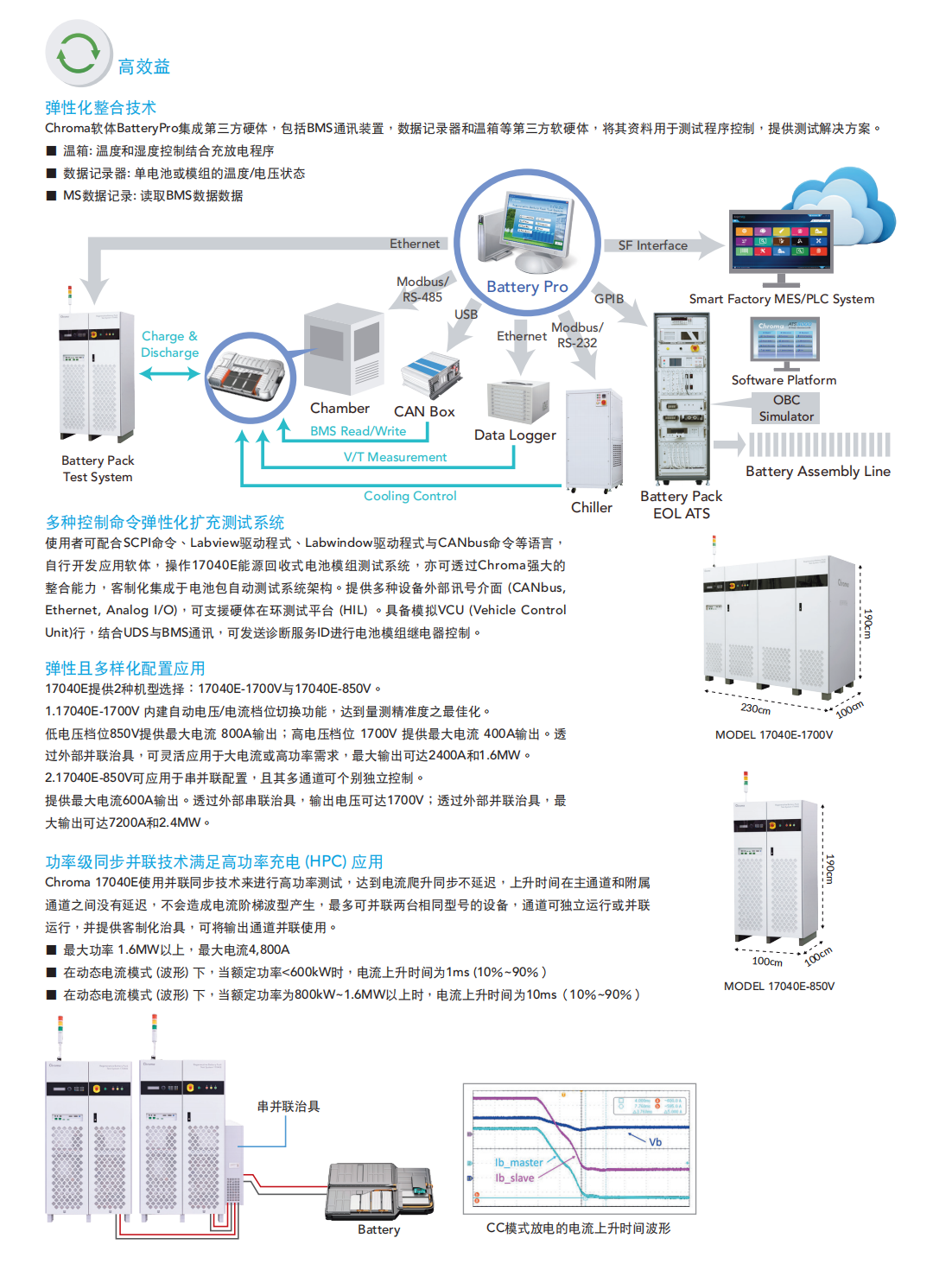 Chroma 17040E电池模组测试系统是专为高功率二次电池组测试而开发的高精密充放电设备,具有能源回收功能,可节省放电过程所消耗的大量电能,即使动态充放电,也能确保电网端维持稳定,不致因谐波污染影响其他设备。